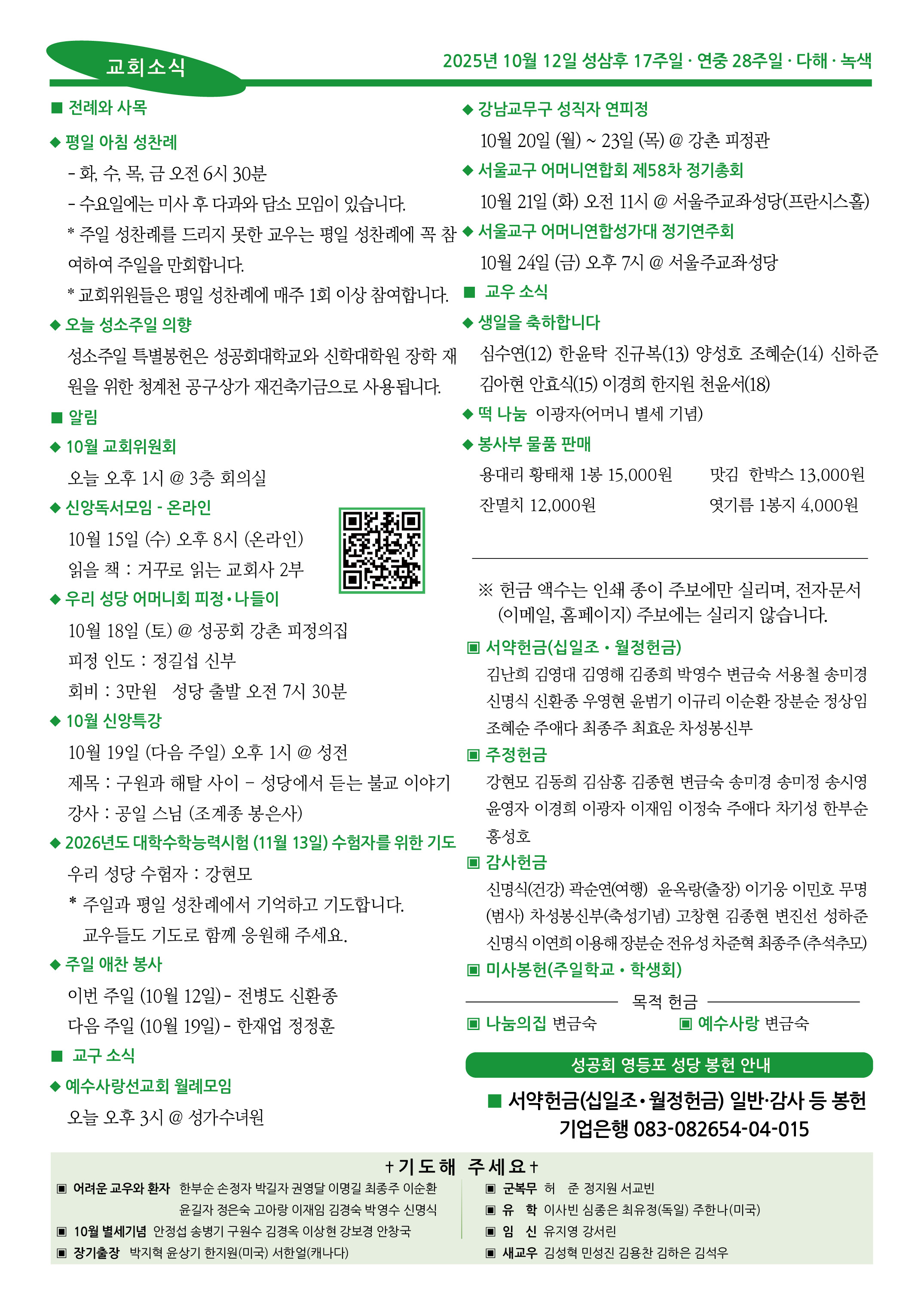 | 이전글 | 2025년 10월 19일 성삼후 18주일 · 연중 29주일 | 강현모 | 2025.10.18 | 0 | 75 |