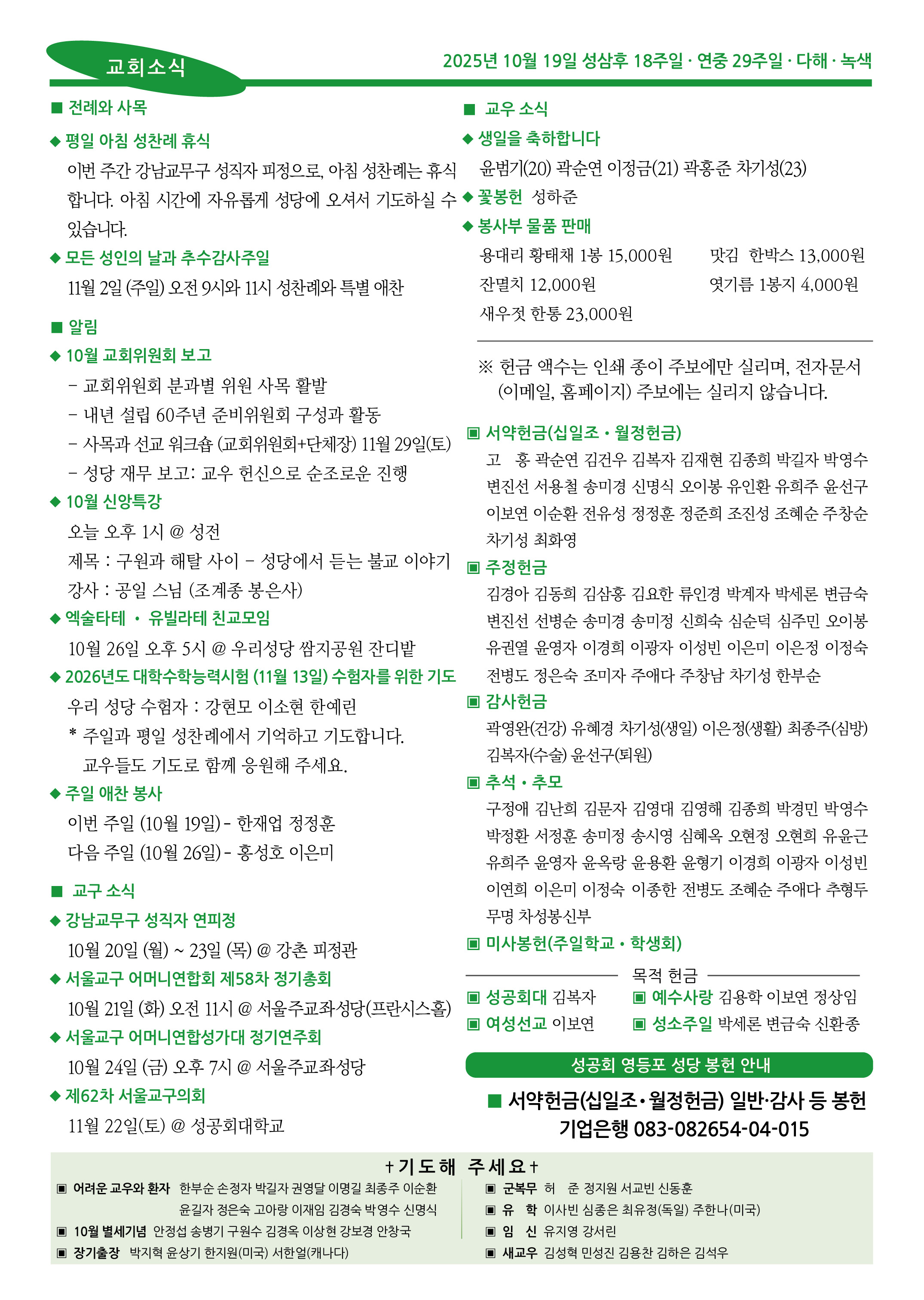 | 이전글 | 2025년 10월 26일 성삼후 19주일 · 연중 30주일 | 강현모 | 2025.10.25 | 0 | 51 |