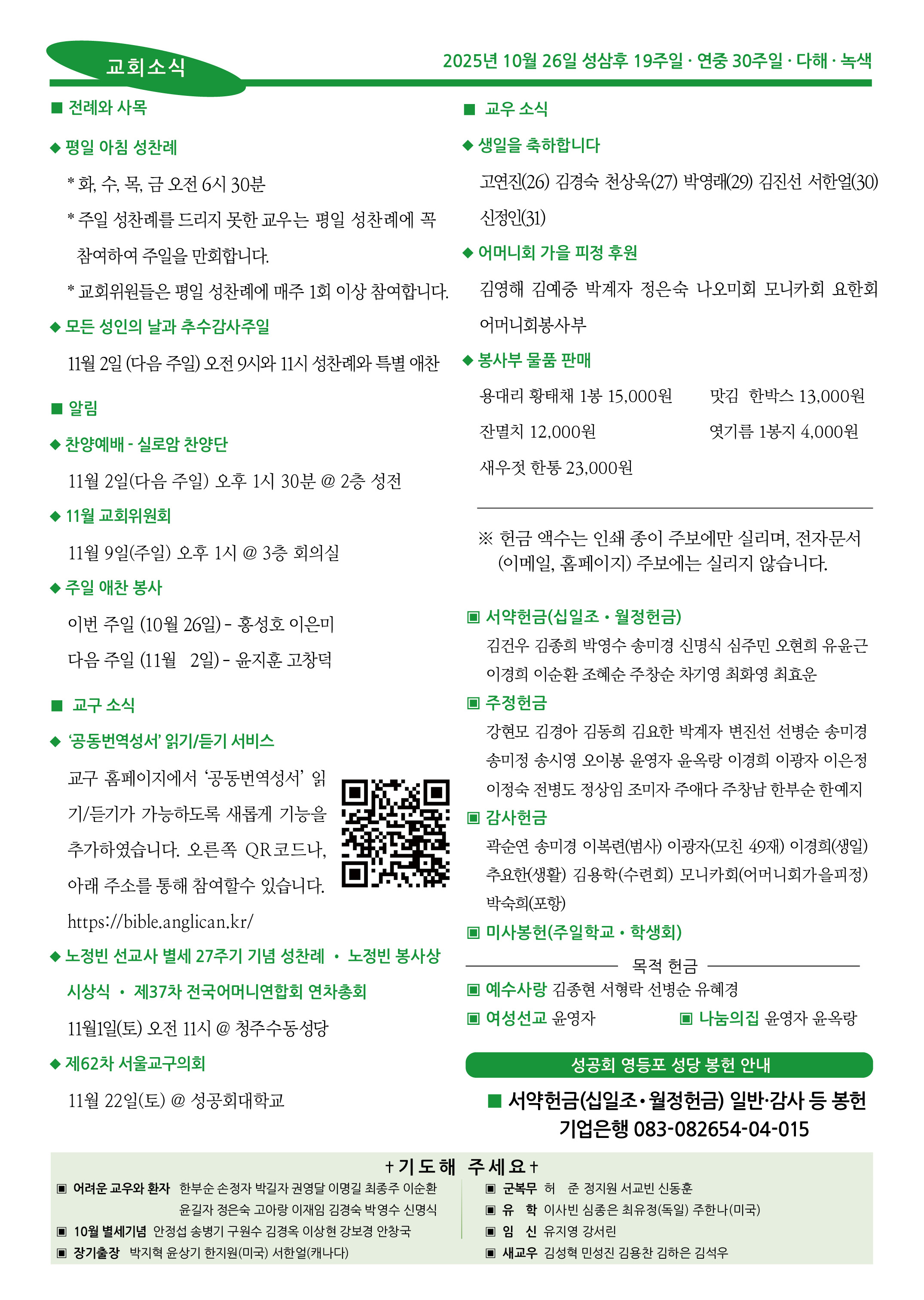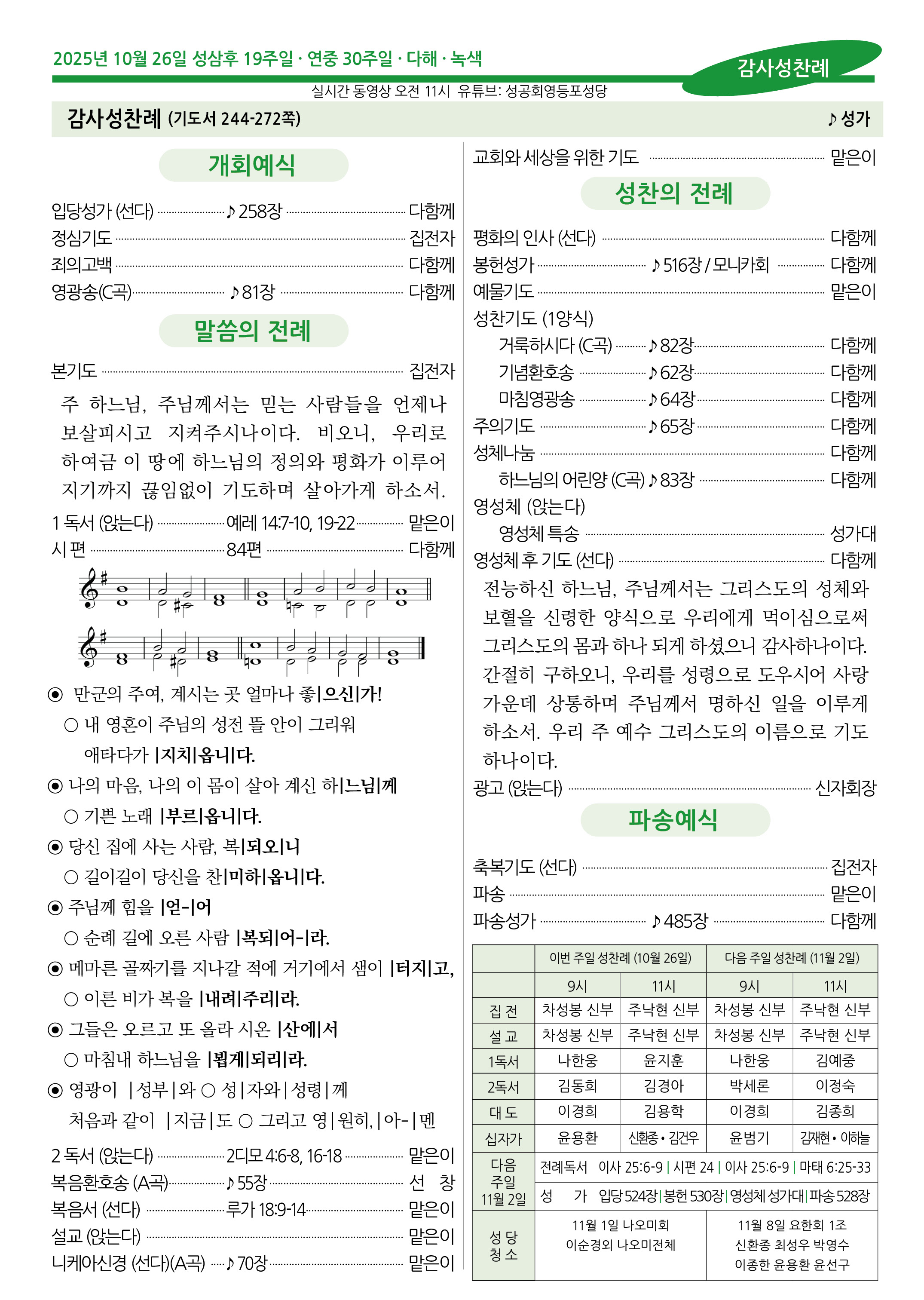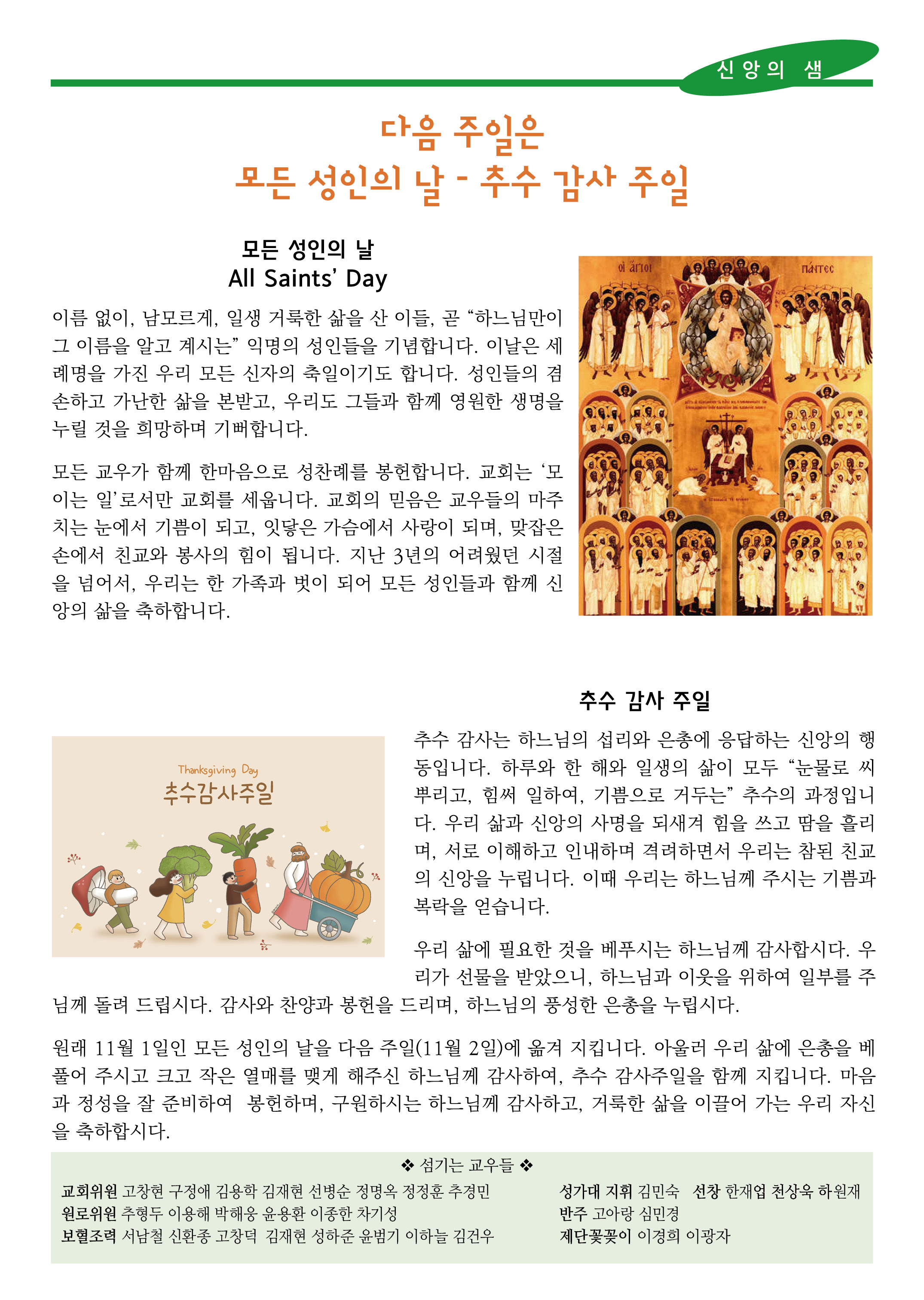 | 이전글 | 2025년 11월 2일 모든성인의날 · 추수감사주일 · 성삼후 20주일 | 강현모 | 2025.11.01 | 0 | 15 |