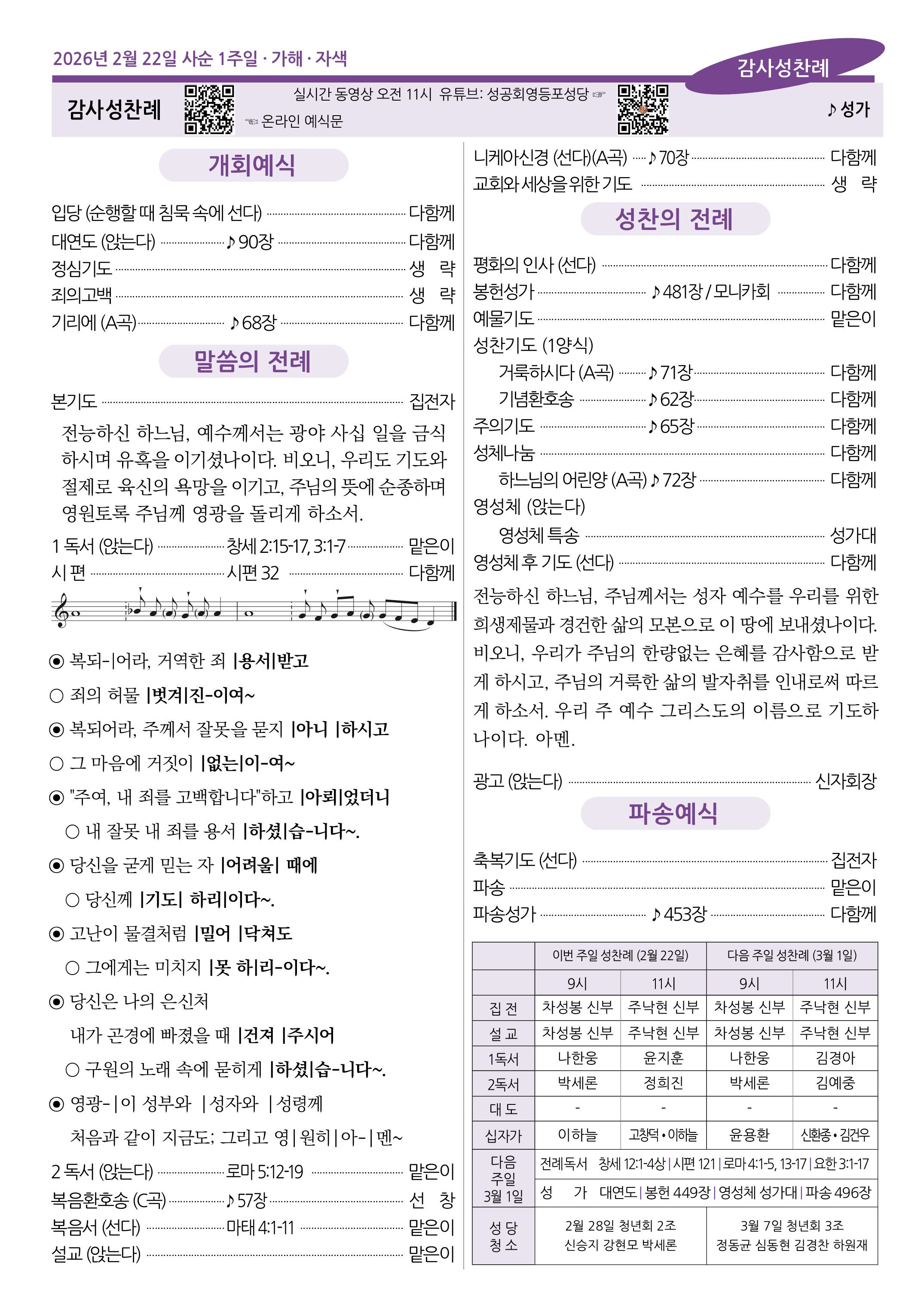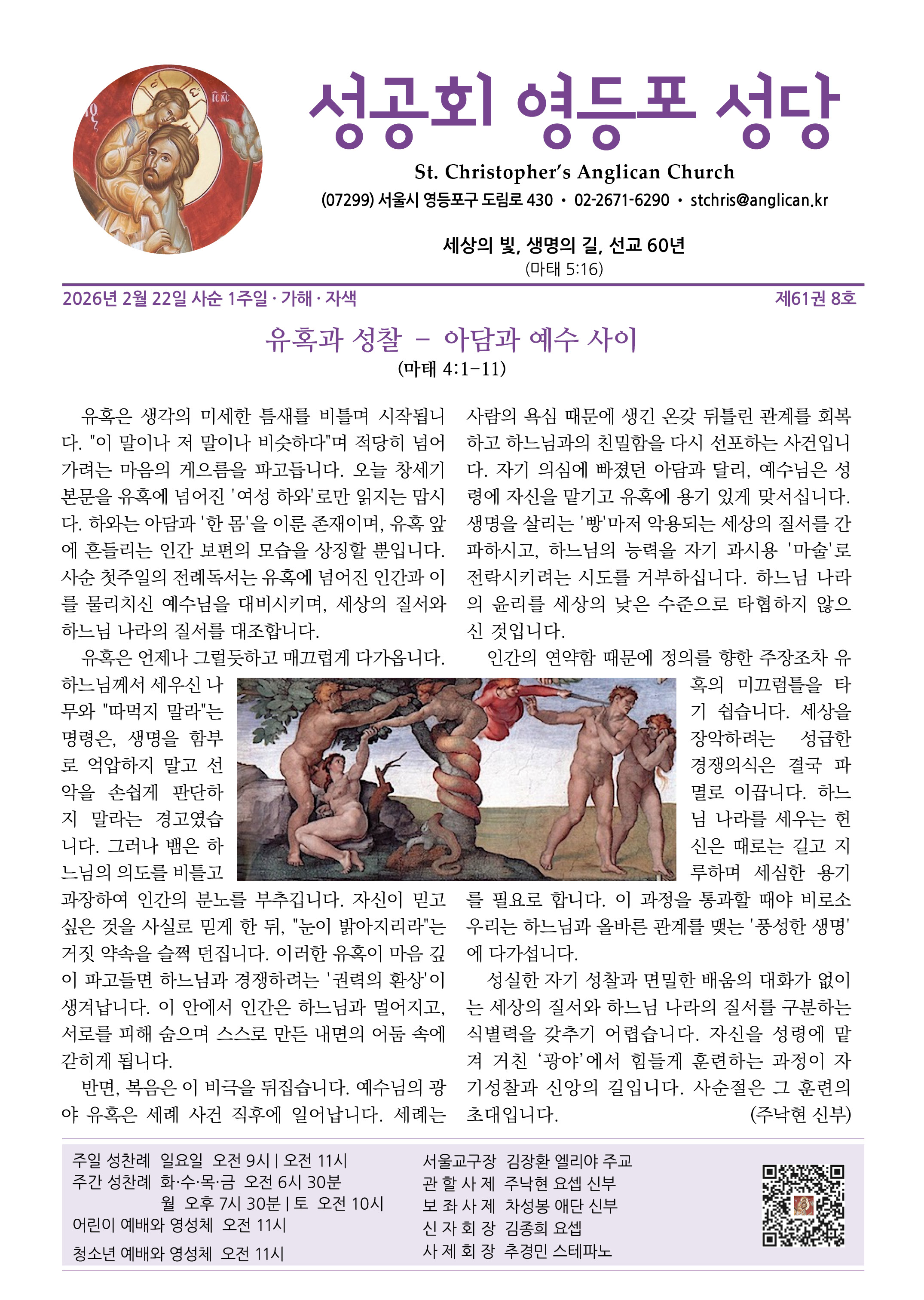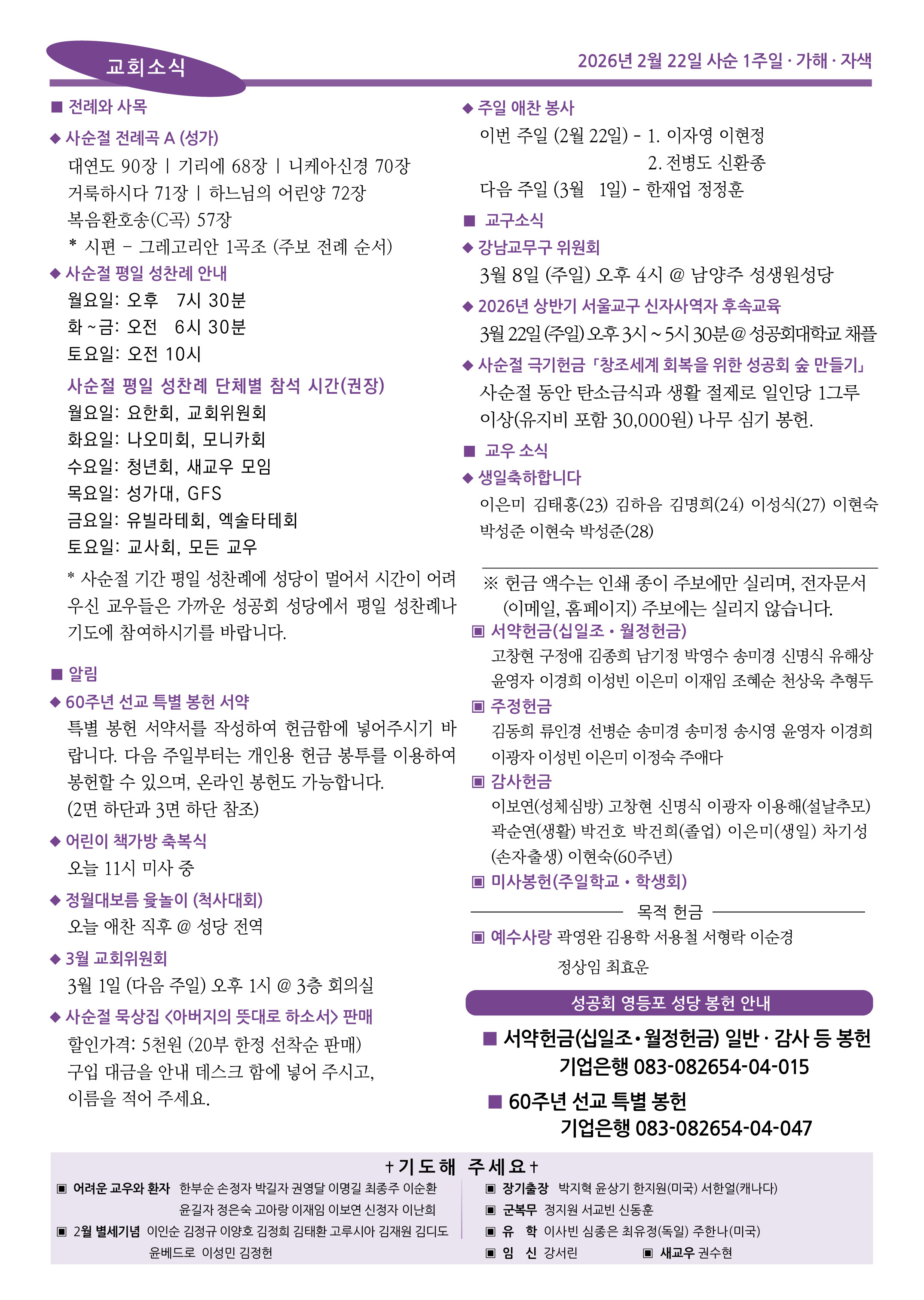 2026년 2월 22일 사순 1주일 강현모 2026-02-22 추천 0 댓글 0 조회 6 http://stchristopher.onmam.com/bbs/bbsView/98/6609895 첨부파일 (0) 0